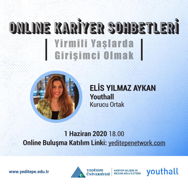 Youthall Kurucu Ortağı Elis Yılmaz Aykan ile 1 Haziran 2020 Pazartesi günü Saat 18:00'de gerçekleştireceğimiz, Yirmili Yaşlarda Girişimci Olmayı konuşacağımız Yeditepelilere özel "Online Kariyer Sohbetleri"ne seni de bekliyoruz.