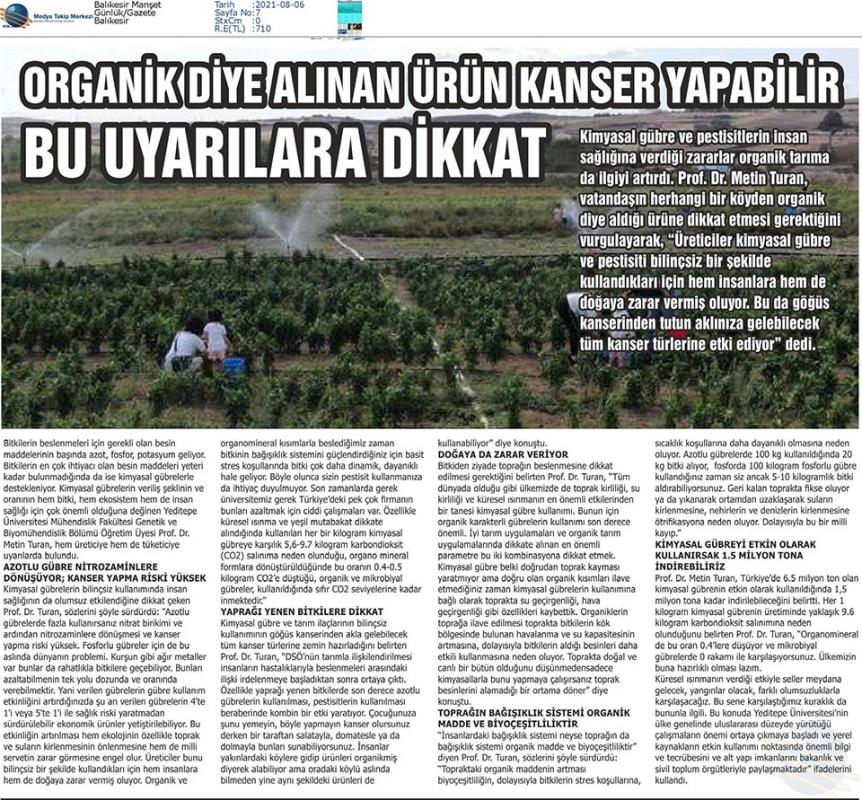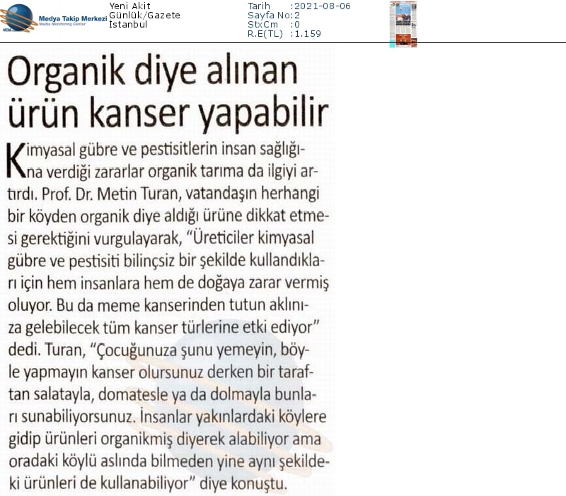 Kimyasal gübre ve pestisitlerin insan sağlığına verdiği zararlar organik tarıma da ilgiyi artırdı. Prof. Dr. Metin Turan, vatandaşın herhangi bir köyden organik diye aldığı ürüne dikkat etmesi gerektiğini vurgulayarak, “Üreticiler kimyasal gübre ve pestisiti bilinçsiz bir şekilde kullandıkları için hem insanlara hem de doğaya zarar vermiş oluyor. Bu da göğüs kanserinden tutun aklınıza gelebilecek tüm kanser türlerine etki ediyor” dedi.