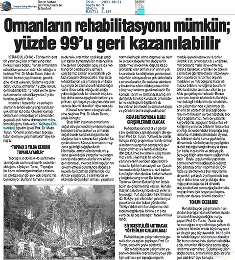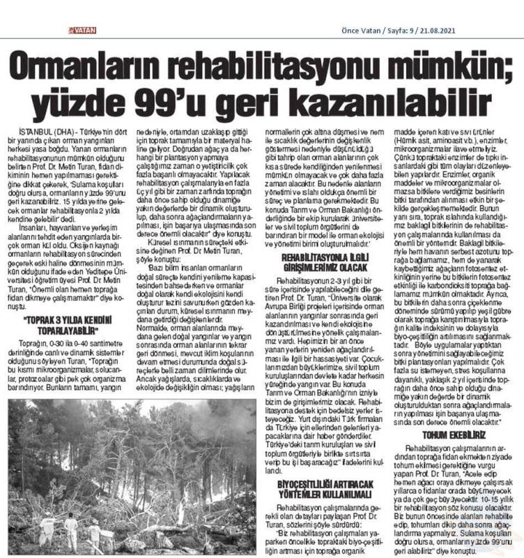 İnsanları, hayvanları ve yerleşim alanlarını tehdit eden yangınlarda birçok orman kül oldu. Oksijen kaynağı ormanların rehabilitasyon sürecinden geçerek eski haline dönmesinin mümkün olduğunu ifade eden Yeditepe Üniversitesi öğretim üyesi Prof. Dr. Metin Turan, “Önemli olan hemen toprağa fidan dikmeye çalışmamaktır. Toprak, 0-30 ila 0-40 santimetre derinliğinde canlı ve dinamik sistemler var. Toprağın bu kısmı mikroorganizmalar, solucanlar, protozoalar gibi pek çok organizma barındırıyor. Bunların tamamı, yangın nedeniyle, ortamdan uzaklaşıp gittiği için toprak tamamıyla bir materyal haline geliyor. Doğrudan ağaç ya da herhangi bir plantasyon yapmaya çalıştığımız zaman o yetiştiricilik çok fazla başarılı olmayacaktır. Yapılacak rehabilitasyon çalışmalarıyla en fazla üç yıl gibi bir zaman zarfında toprağın daha önce sahip olduğu dinamiğe yakın değerlerde bir dinamik oluşturulup, daha sonra ağaçlandırmaların yapılması, işin başarıya ulaşmasında son derece önemli olacaktır” diye konuştu.