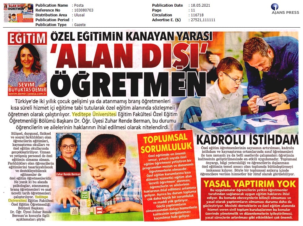 Türkiye’de iki yıllık çocuk gelişimi ya da atanmamış branş öğretmenleri kısa süreli hizmet içi eğitime tabi tutularak özel eğitim alanında sözleşmeli öğretmen olarak çalıştırılıyor. Yeditepe Üniversitesi Eğitim Fakültesi Özel Eğitim Öğretmenliği Bölümü Başkanı Dr. Öğr. Üyesi Zuhar Rende Berman, bu durumu öğrencilerin ve ailelerinin haklarının ihlal edilmesi olarak nitelendirdi. // Sevim Büyüktaş Demir- Posta