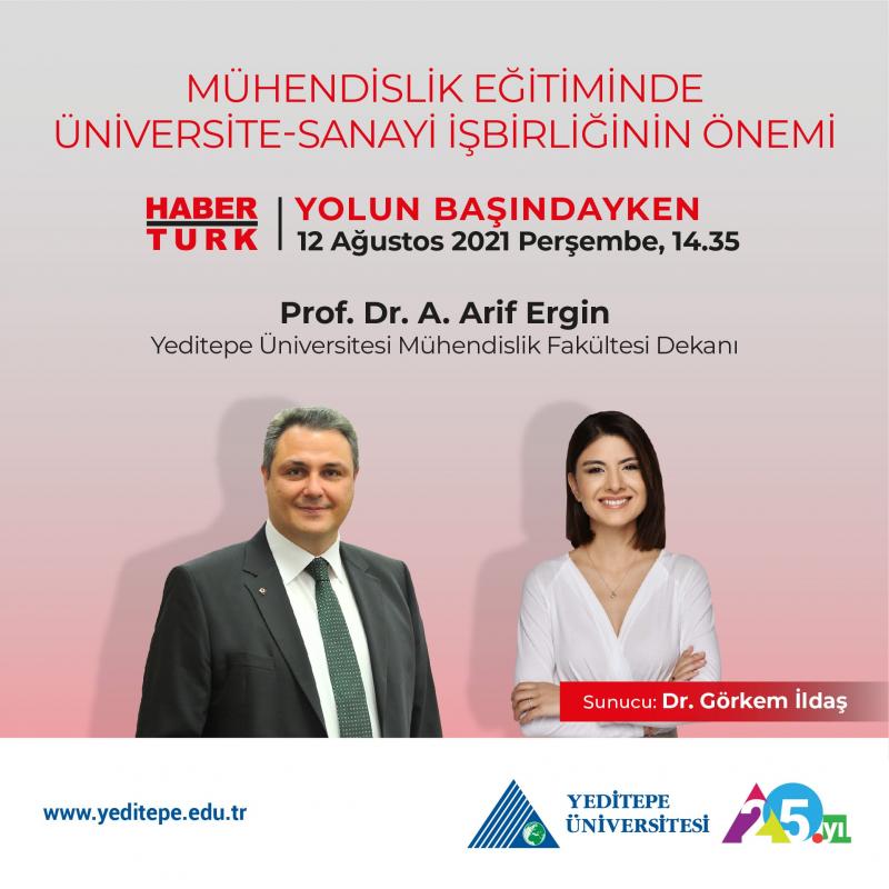 Yeditepe Üniversitesi Mühendislik Fakültesi Dekanı Prof. Dr. A. Arif Ergin, 12 Ağustos 2021, Perşembe günü, saat 14.35’de Habertürk televizyonunda yayınlanan Yolun Başındayken programında, Dr. Görkem İldaş'ın konuğu oluyor. Prof. Dr. A. Arif Ergin, mühendislik fakültelerinde güncel gelişmeler doğrultusunda eğitim programlarının nasıl güncellendiğine ilişkin bilgiler verirken üniversite-sanayi işbirliklerinin önemine değiniyor.