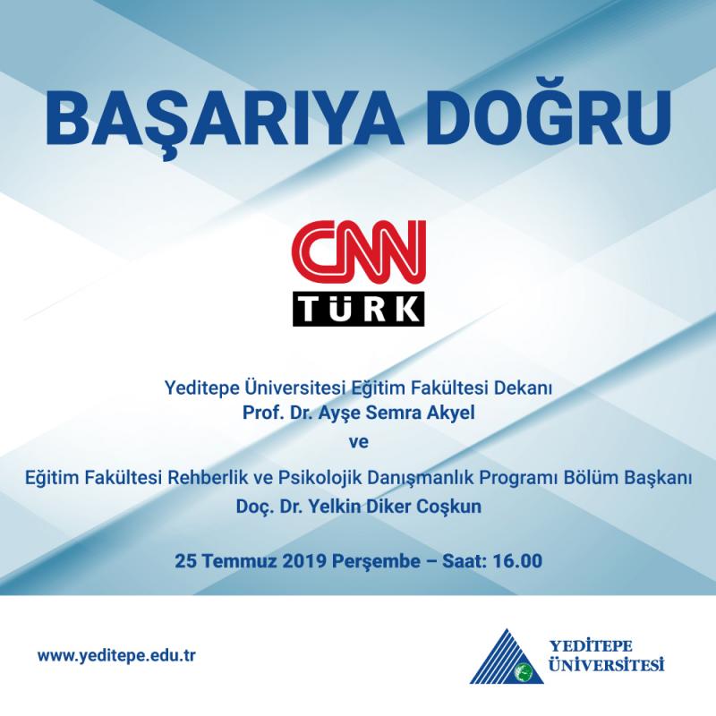 Yeditepe Üniversitesi Eğitim Fakültesi Dekanı Prof. Dr. Ayşe Semra Akyel ve Eğitim Fakültesi Rehberlik ve Psikolojik Danışmanlık Programı Bölüm Başkanı Doç. Dr. Yelkin Diker Coşkun 25 Temmuz 2019 Perşembe günü 16.00’da CNN Türk’te “Başarıya Doğru” programında Sait Gürsoy’un sorularını yanıtlayacak.