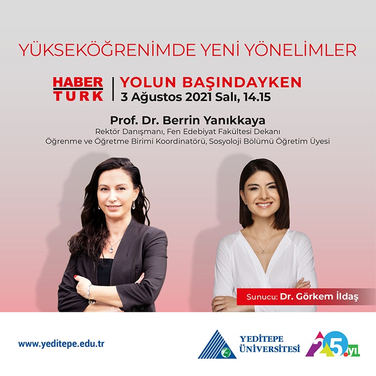 Yeditepe Üniversitesi Rektör Danışmanı, Fen Edebiyat Fakültesi Dekanı, Öğrenme ve Öğretme Birimi Koordinatörü ve Sosyoloji Bölümü öğretim üyesi Prof. Dr. Berrin Yanıkkaya, 3 Ağustos Salı günü, saat 14.15’te, Habertürk televizyonunda yayınlanan Yolun Başındayken programında, Dr. Görkem İldaş'ın konuğu oluyor. Yanıkkaya, yükseköğretimde yeni yönelimlere dair görüşlerini paylaşıyor.