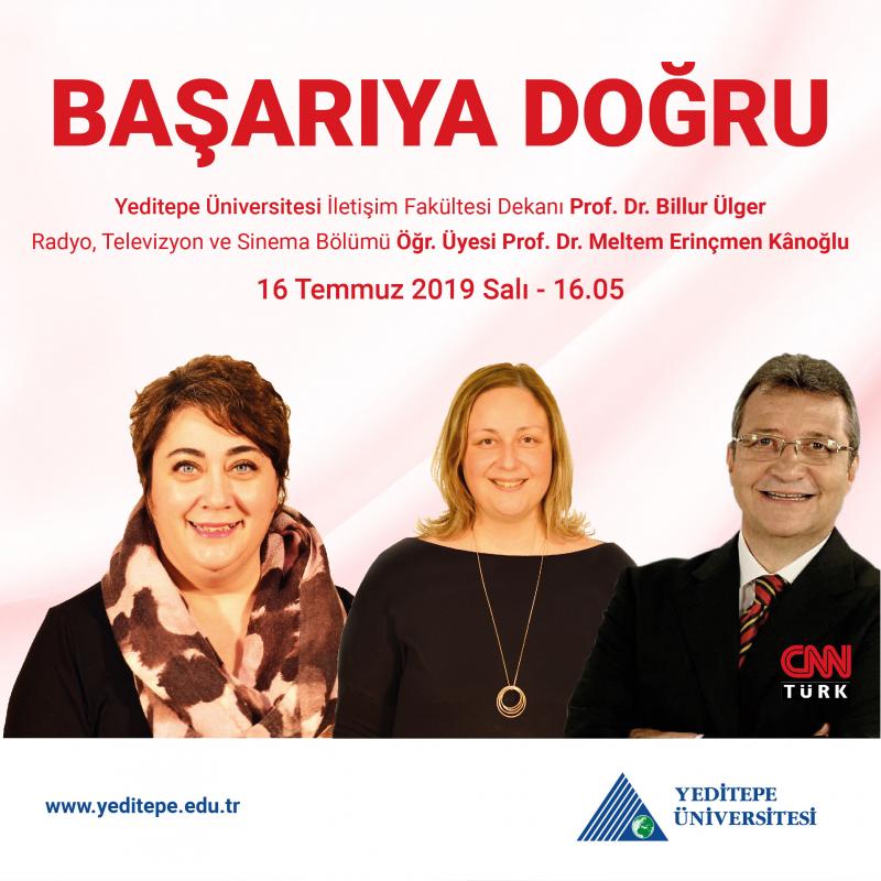 Yeditepe Üniversitesi İletişim Fakültesi Dekanı Prof. Dr. Billur Ülger ve Radyo, Televizyon ve Sinema Bölümü Öğr. Üyesi Prof. Dr. Meltem Erinçmen Kanoğlu 16 Temmuz 2019 Salı günü 16.05’te CNN Türk’te “Başarıya Doğru” programında Sait Gürsoy’un sorularını yanıtlayacak.