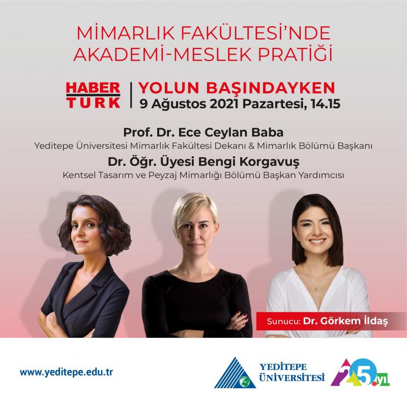 Yeditepe Üniversitesi Mimarlık Fakültesi Dekanı ve aynı zamanda Mimarlık Bölümü Başkanı Prof. Dr. Ece Ceylan Baba ile Kentsel Tasarım ve Peyzaj Mimarlığı Bölümü Başkan Yardımcısı Dr. Öğr. Üyesi Bengi Korgavuş, 9 Ağustos 2021, Pazartesi günü, saat 14.15’te Habertürk televizyonunda yayınlanan Yolun Başındayken programında, Dr. Görkem İldaş'ın sorularını yanıtlıyor. Ece Ceylan Baba ve Bengi Korgavuş, Mimarlık Fakültesi'nde akademi-meslek pratiği arakesitinde gerçekleştirilen çalışmalar; projeler, işbirlikleri, iş olanakları ve sürdürülebilirlik üzerine konuşuyor.