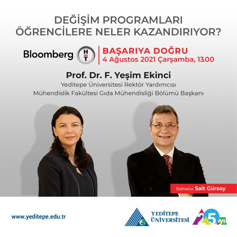 Yeditepe Üniversitesi Rektör Yardımcısı ve aynı zamanda Mühendislik Fakültesi Gıda Mühendisliği Bölümü Başkanı Prof. Dr. F. Yeşim Ekinci, 4 Ağustos 2021, Çarşamba günü, saat 13.00’te, Bloomberg HT’de yayınlanan Başarıya Doğru programında, Sait Gürsoy’un sorularını yanıtlıyor. Prof. Dr. Ekinci, Yeditepe Üniversitesi’ndeki öğrenci değişim programlarına ilişkin bilgiler verirken bu programların öğrencilere kazandırdıklarına işaret ediyor.