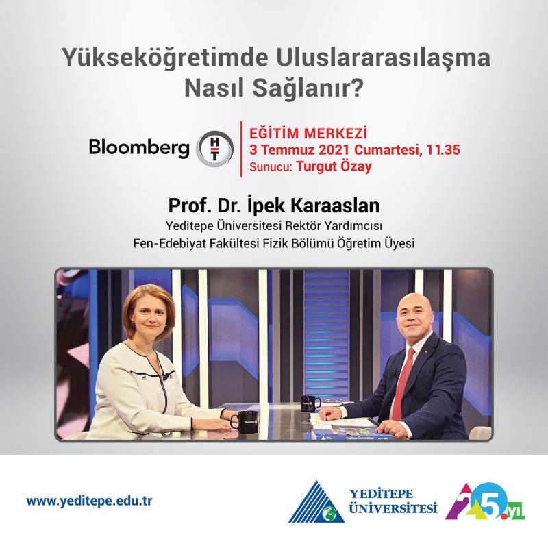 Yeditepe Üniversitesi Rektör Yardımcısı ve aynı zamanda Fen Edebiyat Fakültesi Fizik Bölümü öğretim üyesi Prof. Dr. İpek Karaaslan, 3 Temmuz Cumartesi günü, saat 11.35’te, Eğitim Merkezi’nde Turgut Özay’ın sorularını yanıtlıyor. Prof. Dr. İpek Karaaslan programda, yükseköğretimde uluslararasılaşma kavramını tüm yönleriyle ele alıyor.