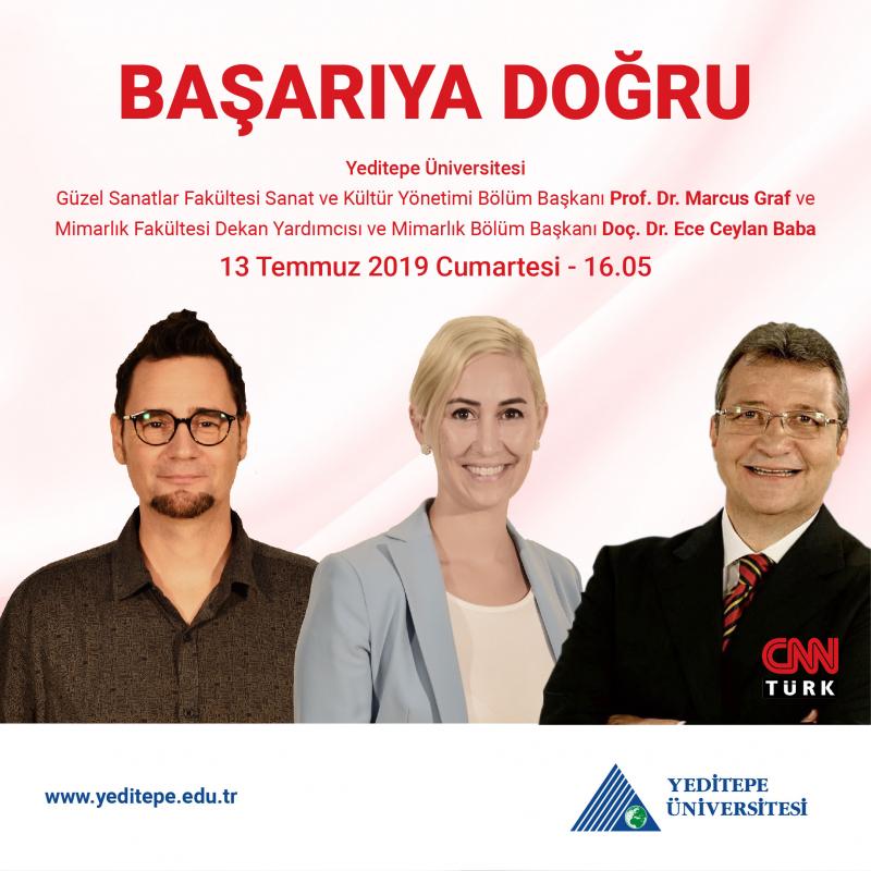 Yeditepe Üniversitesi Güzel Sanatlar Fakültesi Sanat ve Kültür Yönetimi Bölüm Başkanı Prof. Dr. Marcus Graf ve Mimarlık Fakültesi Dekan Yardımcısı ve Mimarlık Bölüm Başkanı Doç. Dr. Ece Ceylan Baba 13 Temmuz 2019 Cumartesi günü 16.05’te CNN Türk’te “Başarıya Doğru” programında Sait Gürsoy’un sorularını yanıtlayacak.