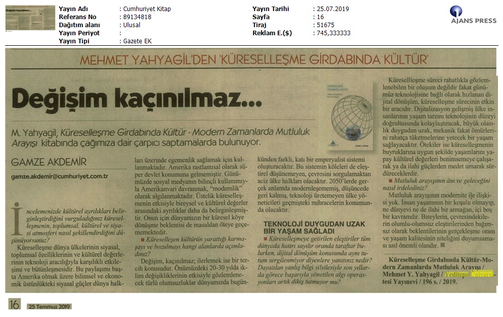 Üniversitemiz İktisadi ve İdari Bilimler Fakültesi İşletme Bölümü öğretim üyesi Prof. Dr. Mehmet Yahyagil, Cumhuriyet gazetesi yazarı Gamze Akdemir’in sorularını yanıtladı. “Küreselleşme Girdabında Kültür – Modern Zamanlarda Mutluluk Arayışı” kitabıyla ilgili bilgiler veren Yahyagil, “Bireylerin, çevresindekilerin olumlu-olumsuz eleştirilerinden bağımsız olarak beklentilerinin gerçekleşme oranı ve yaşam kalitesinin niteliğini duyumsaması asıl önemli olandır” diyor.