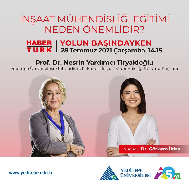 Yeditepe Üniversitesi Mühendislik Fakültesi İnşaat Mühendisliği Bölümü Başkanı Prof. Dr. Nesrin Yardımcı Tiryakioğlu, 28 Temmuz Çarşamba günü, saat 14.15’te, Habertürk televizyonunda yayınlanan Yolun Başındayken programında, Dr. Görkem İldaş'ın sorularını yanıtlıyor. Tiryakioğlu, günümüzde inşaat mühendisliği eğitiminin ne kadar önemli olduğuna dair bilgiler aktarıyor.