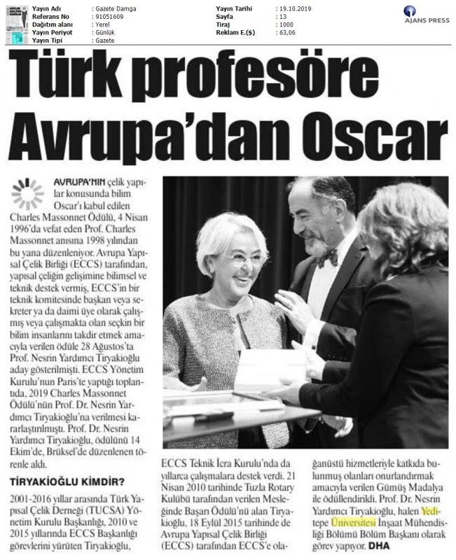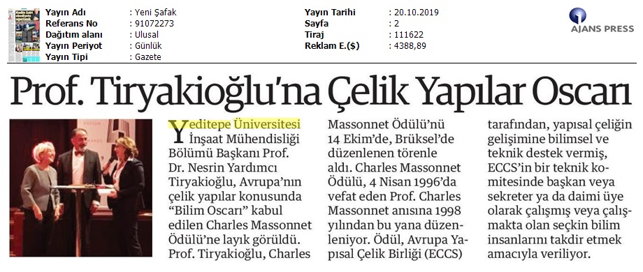 Üniversitemiz İnşaat Mühendisliği Bölümü Başkanı Prof. Dr. Nesrin Yardımcı Tiryakioğlu’nun, Avrupa’nın çelik yapılar konusunda bilim Oscar’ı kabul edilen Charles Massonnet Ödülü’ne değer görülmesi basında geniş yer buldu.