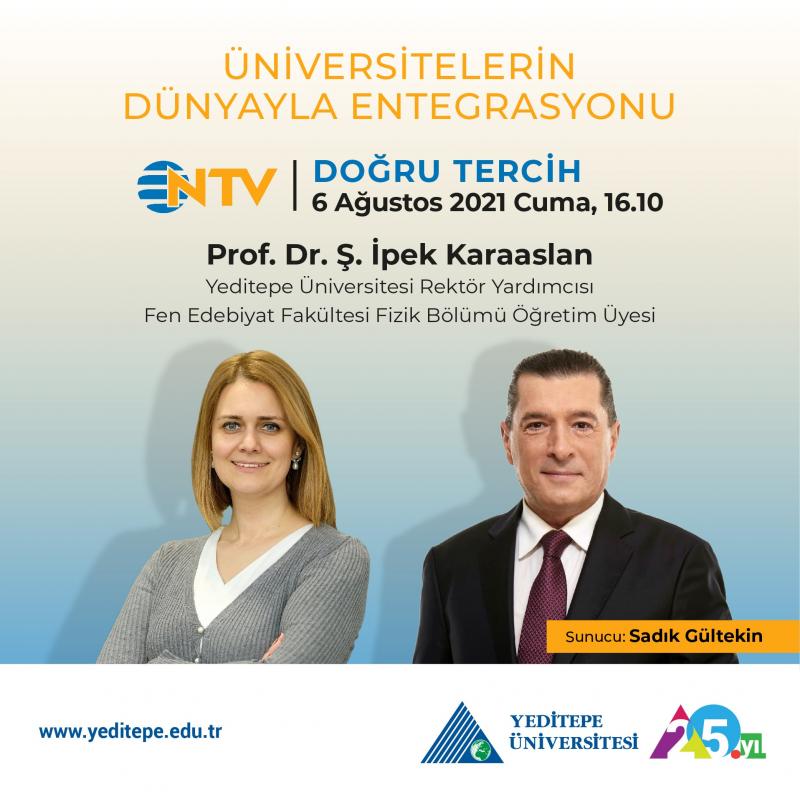 Yeditepe Üniversitesi Rektör Yardımcısı ve aynı zamanda Fen Edebiyat Fakültesi Fizik Bölümü öğretim üyesi Prof. Dr. Ş. İpek Karaaslan, 6 Ağustos 2021, Cuma günü, saat 16.10’da, NTV’de yayınlanan Doğru Tercih programında, Sadık Gültekin’in konuğu oluyor. Prof. Dr. Karaaslan, üniversitelerin dünyayla entegrasyonunun önemine değinirken Yeditepe Üniversitesi’nde bu yönde yapılan çalışmalara dair bilgiler aktarıyor.