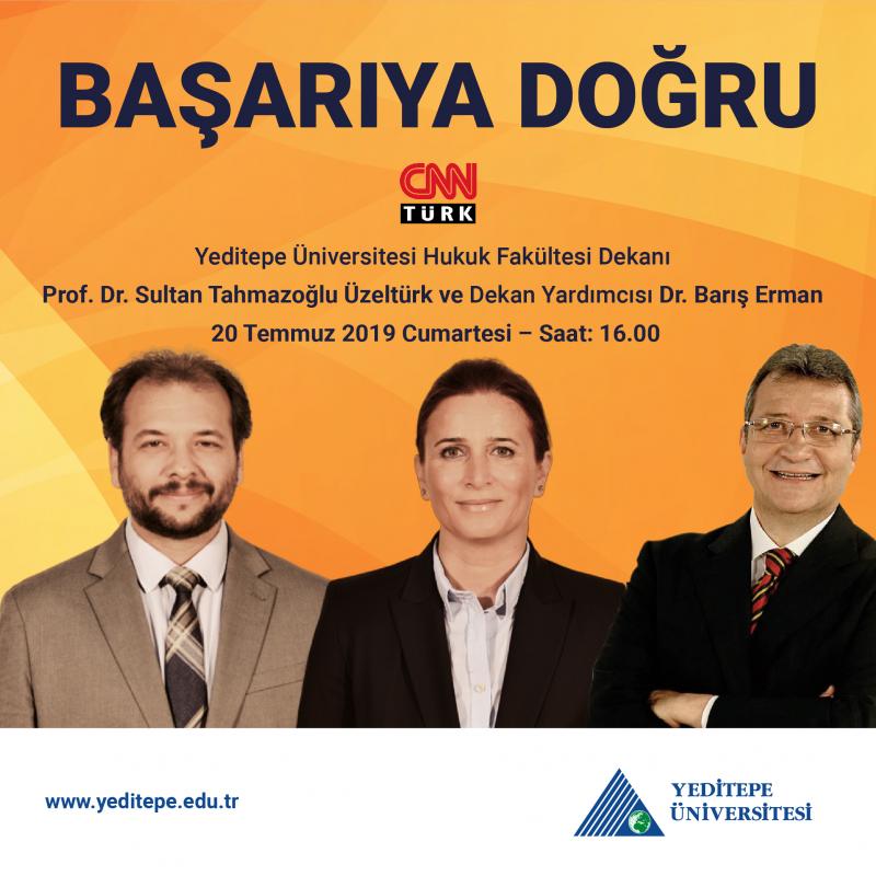 Yeditepe Üniversitesi Hukuk Fakültesi Dekanı Prof. Dr. Sultan Tahmazoğlu Üzeltürk ve Dekan Yardımcısı Dr. Barış Erman 20 Temmuz 2019 Cumartesi günü 16.00’da CNN Türk’te “Başarıya Doğru” programında Sait Gürsoy’un sorularını yanıtlayacak.