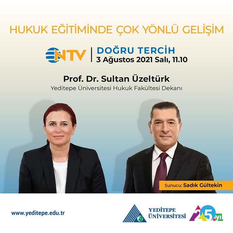 Yeditepe Üniversitesi Hukuk Fakültesi Dekanı Prof. Dr. Sultan Üzeltürk, 3 Ağustos 2021, Salı günü, saat 11.10’da, NTV’de yayınlanan Doğru Tercih programında, Sadık Gültekin’in sorularını yanıtlıyor. Prof. Dr. Sultan Üzeltürk, hukuk eğitiminde öğrencinin çok yönlü gelişimi için yapılması gerekenleri anlatırken hukuk fakültesini tercih etmek isteyen üniversite adaylarına önemli önerilerde bulunuyor.