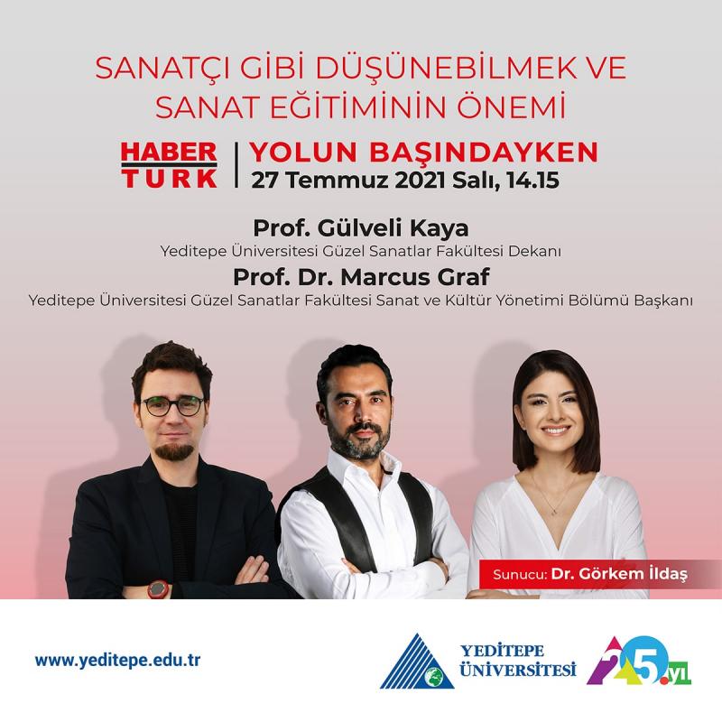 Yeditepe Üniversitesi Güzel Sanatlar Fakültesi Dekanı Prof. Gülveli Kaya ile Sanat ve Kültür Yönetimi Bölümü Başkanı Prof. Dr. Marcus Graf, 27 Temmuz Salı günü, saat 14.15’te, Habertürk televizyonunda yayınlanan Yolun Başındayken programında, Dr. Görkem İldaş'ın sorularını yanıtlıyor. Kaya ve Graf, güzel sanatlar fakültesi bölümlerinden birini tercih etmek isteyen öğrencilere önemli ipuçları veriyor.