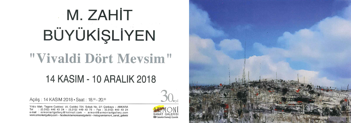 Yeditepe Üniversitesi Güzel Sanatlar Fakültesi Plastik Sanatlar ve Resim Bölümü öğretim üyelerinden Prof.Zahit Büyükişleyen'in ''Vivaldi 4 Mevsim'' sergisi 14 Kasım - 10 Aralık 2018 tarihleri arasında Armoni Sanat Galerisi'nde Sanatseverlerle buluşuyor .