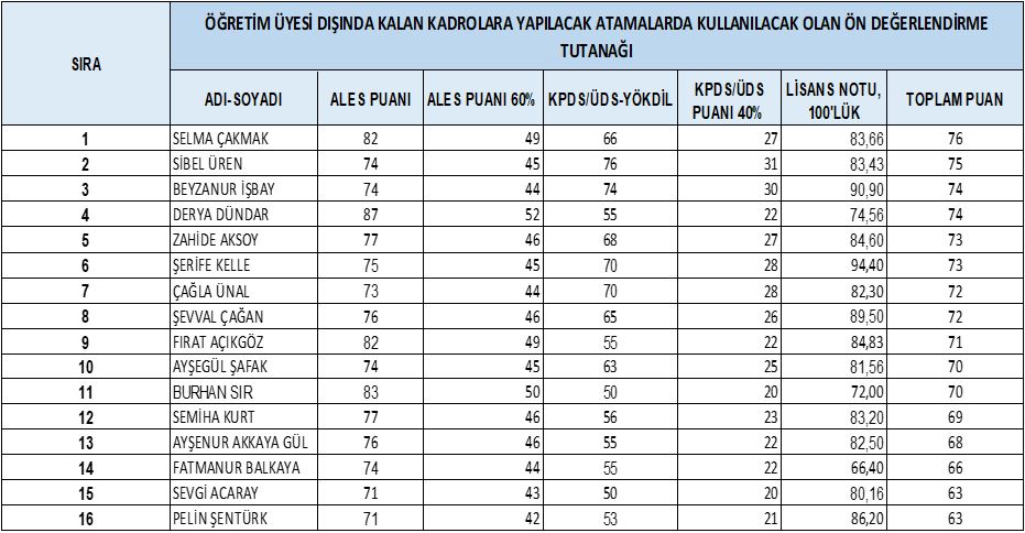 15/11/2021 tarihinde Resmi Gazetede yayınlanan Üniversitemiz Sağlık Bilimleri Fakültesi Hemşirelik Bölümünde ilan edilen 3 adet Araştırma Görevlisi kadrosuna yapılan başvurular değerlendirilmiş olup, ön değerlendirme sonuçlarına göre aşağıda ismi yazılı kişi/kişiler 02/12/2021 tarihinde saat: 10.00 - 12.00 arası Sağlık Bilimleri Fakültesi, Mühendislik Binası -1. Kat, B217 no’lu salonda yapılacak olan sınava girmeye hak kazanmışlardır.