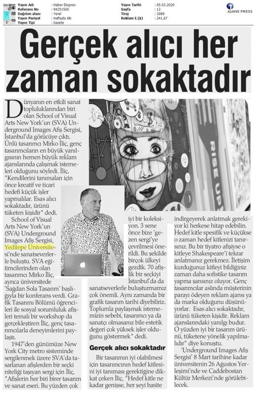 School of Visual Arts New York’un (SVA) Underground Images Afiş Sergisi, Yeditepe Üniversitesi’nde sanatseverlerle buluştu. SVA eğitimcilerinden olan tasarımcı Mirko İliç, ayrıca üniversitede ‘Sağdan Sola Tasarım’ başlığıyla bir konferans verdi. Grafik Tasarımı Bölümü öğrencileri ile sosyal sorumluluk afişleri temalı bir workshop da gerçekleştiren İliç, genç tasarımcılarla deneyimlerini paylaştı.