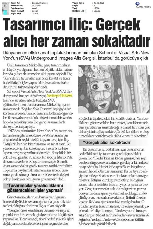 Dünyanın en etkili sanat topluluklarından biri olan School of Visual Arts New York’un (SVA) Underground Images Afiş Sergisi, İstanbul’da görücüye çıktı. Ünlü tasarımcı Mirko İliç, genç tasarımcıların en büyük yanılgısının hemen büyük reklam ajanslarında çalışmak istemeleri olduğunu söyledi. İliç, “Kendilerini tanımaları için önce kreatif ve ticari hedefi küçük işler yapmalılar. Esas alıcı sokaktadır, ürünü tüketen kişidir” dedi.