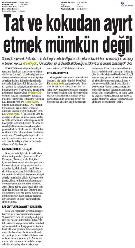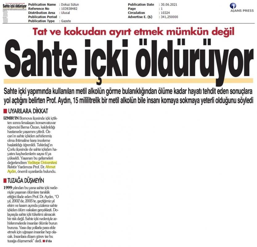 İzmir'in Bornova ilçesinde içki içtikten sonra fenalaşan konservatuvar öğrencisi Berna Özcan (25), kaldırıldığı hastanede yaşamını yitirdi. Özcan'ın sahte içkiden zehirlenmiş olma ihtimaline karşı inceleme başlatıldığı öğrenildi. Tekirdağ'ın Çorlu ilçesinde de sahte içkiden hayatını kaybedenlerin sayısı 6'ya yükseldi. Yaşanan bu gelişmeleri değerlendiren Yeditepe Üniversitesi Rektör Yardımcısı ve Eczacılık Fakültesi Farmasötik Toksikoloji Anabilim Dalı Başkanı Prof. Dr. Ahmet Aydın, önemli uyarılarda bulundu.