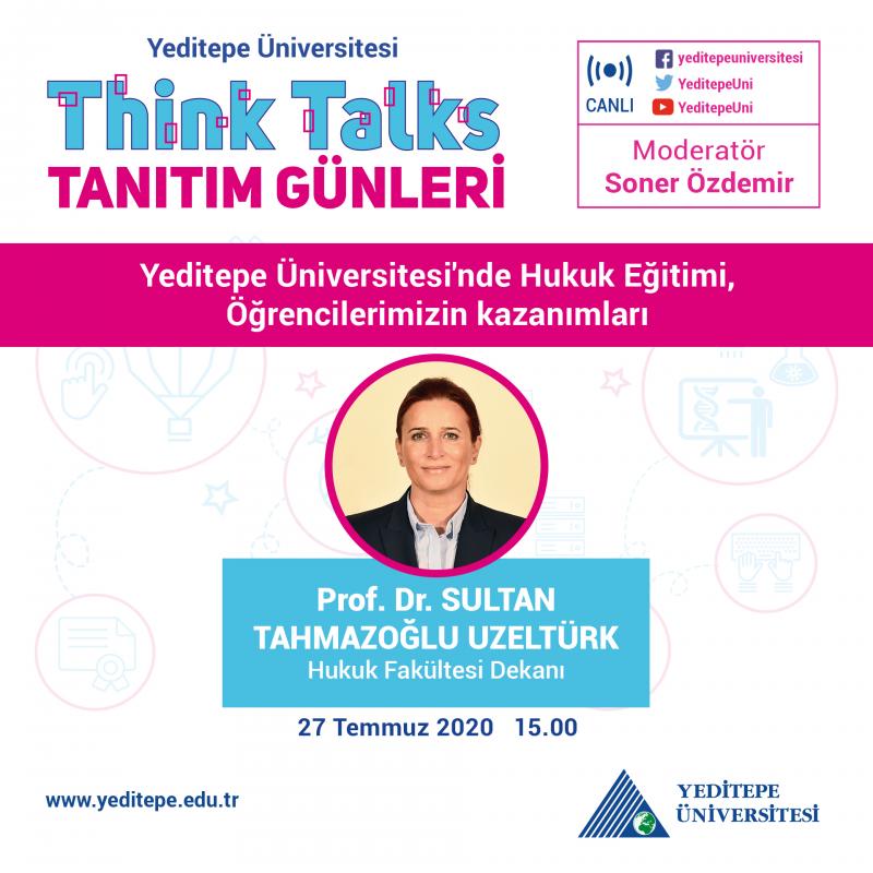 Think Talks Tanıtım Günleri'nin Youtube, Facebook ve Twitter'dan canlı yayınlanacak bölümünde Hukuk Fakültesi Dekanı Prof. Dr. Sultan Tahmazoğlu Uzeltürk'ü ağırlıyoruz.