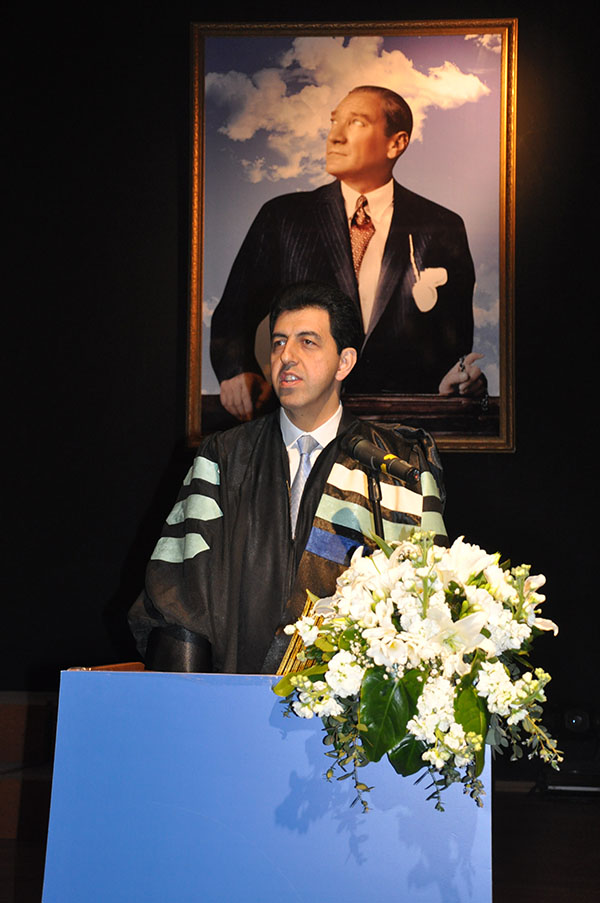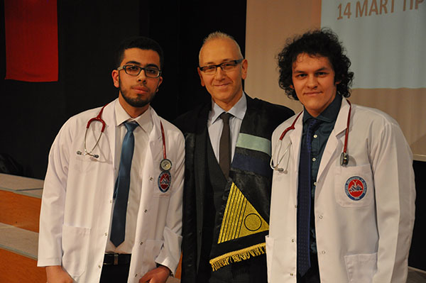 Önlük giyme töreninin açılış konuşmasını yapan Yeditepe Üniversitesi Tıp Fakültesi Dekanı Prof. Dr. Sina Ercan sözlerine yurt dışından yeni dönen İSTEK Vakfı ve üniversitemizin Kurucu Başkanı Bedrettin Dalan’a teşekkür ederek başladı. Bu törenin kendileri için üçlü bir bayram olduğunu belirten Prof. Dr. Ercan, bunlardan ilkinin hekimlik mesleğinin bayramı kabul edilen 14 Mart Tıp Bayramı, diğerinin öğrencilerin mesleğe geçişini simgeleyen önlük töreni, üçüncüsünün ise Bedrettin Dalan’ın dönüşü olduğunu söyledi.