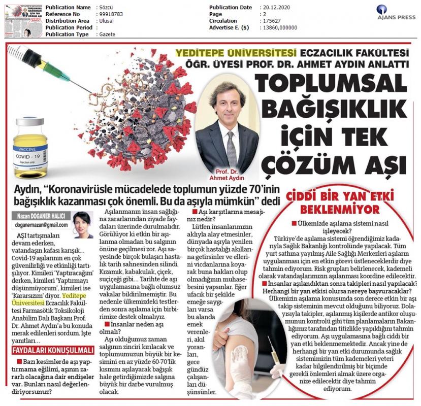 Üniversitemiz Rektör Yardımcısı ve Eczacılık Fakültesi Farmasötik Toksikoloji Anabilim Dalı Başkanı Prof. Dr. Ahmet Aydın, aşı çalışmalarıyla ilgili görüşlerini Sözcü gazetesiyle paylaştı. Prof. Dr. Aydın, “Coronavirüsle mücadelede toplumun yüzde 70’inin bağışıklık kazanması çok önemli. Bu da aşıyla mümkün” dedi.