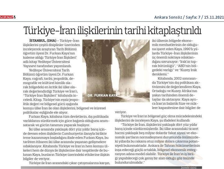 Kitabında Türkiye ve İran’ın, hem komşu ülkeleri hem de dünya ile ilişkilerine dair önemli tespitlerde de bulunan Furkan Kaya, bunların Türkiye üzerindeki etkilerine ilişkin bilgiler de veriyor.