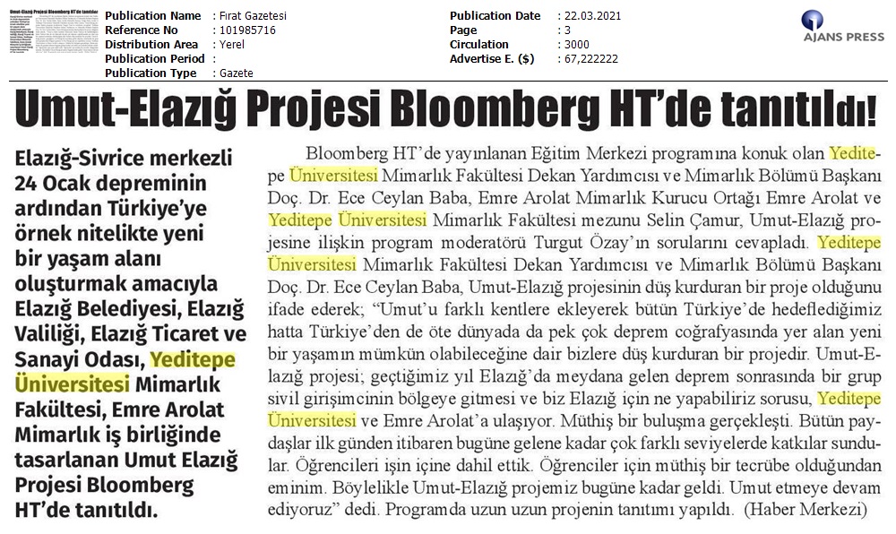 Doç. Dr. Ece Ceylan Baba, projenin, Türkiye ve dünyada deprem bölgesinde yaşayan insanlar için yeni bir yaşamın var olabileceğine dair umut olduğunu belirtti. Emre Arolat da, Elazığ yerel yönetimlerinin de sahip çıktığı nitelikli bir mimari ürün olan Umut-Elazığ projesinin Elazığ’ın yanı sıra herhangi bir şehirde, o şehrin dokusuna uygun olarak uygulanabilecek bir proje olduğunu söyledi.
