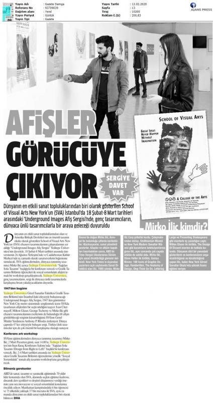 Dünyanın en etkili sanat topluluklarından olan ve Amerika Birleşik Devletleri’nin en önemli tasarım okulu olarak gösterilen School of Visual Arts New York’un (SVA) efsanevi tasarımcılarının çalışmalarının yer aldığı “Underground Images Afiş Sergisi” Yeditepe Üniversitesi’nin davetiyle, 18 Şubat-8 Mart tarihleri arasında üniversitenin 26 Ağustos Yerleşimi’nde ve Caddebostan Kültür Merkezi’nde eş zamanlı olarak sanatseverlerin beğenisine sunulacak.