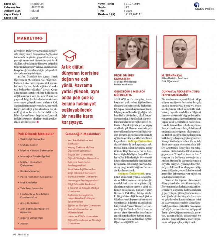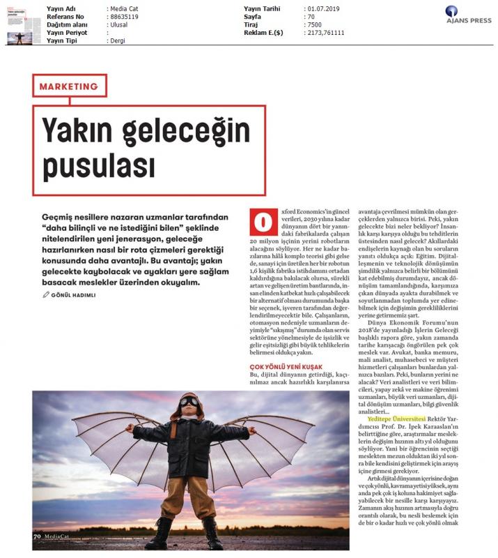 Üniversitemiz Rektör Yardımcısı Prof. Dr. İpek Karaaslan, Marketing Türkiye dergisiyle geleceğin mesleklerine ilişkin görüşlerini paylaştı.