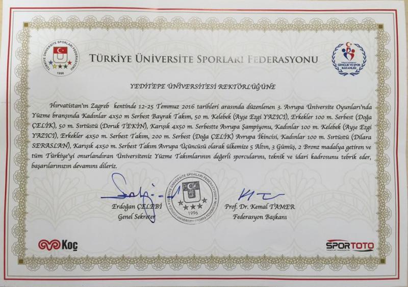 Hırvatistan’ın Zagrep ve Rijeka kentlerinde 10-26 Temmuz 2016 tarihleri arasında yapılan 3. Avrupa Üniversite Oyunları’nda; Üniversitemiz Yüzme Takımı 35 Ülkeden 200 Üniversite arasında madalya sıralamasında 2. olarak tarihi bir başarıya imza attı.