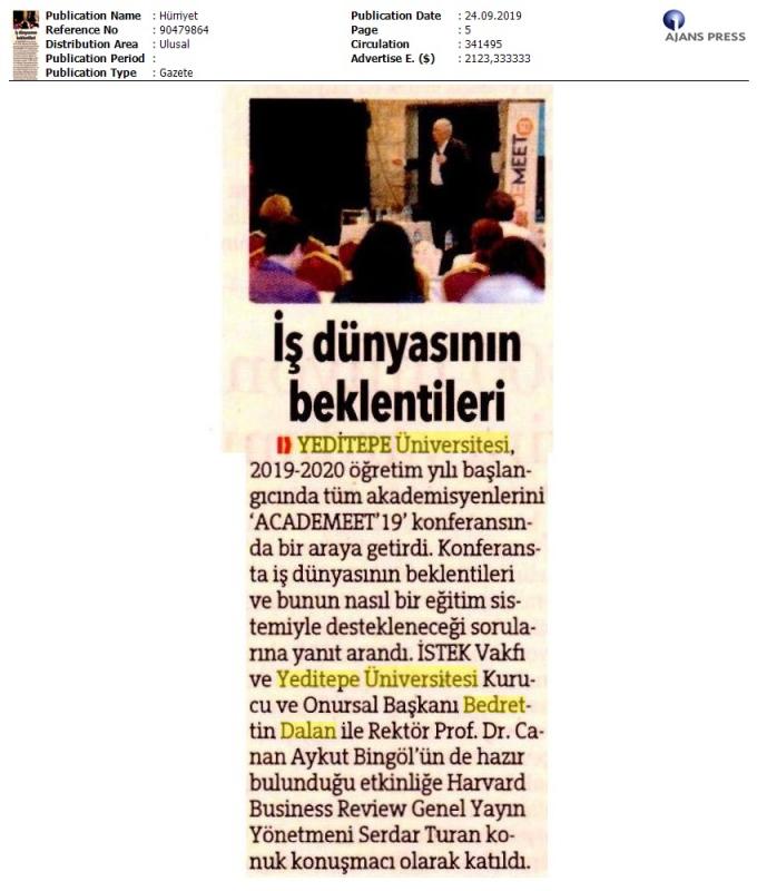 Etkinliğe konuk konuşmacı olarak katılan Harvard Business Review Genel Yayın Yönetmeni Serdar Turan da, “İş Dünyası Akademiden Ne Bekliyor?” başlıklı konuşmasında, iş dünyasının “kendisinin farkında olan, sürekli öğrenmeyi içselleştirmiş, keşiflere açık, yılmazlık duygusu güçlü, yeni nesil öğrenme araçlarına açık, ticari-beşeri-sosyal-pozitif psikoloji sermeyesi biriktirmiş bireylere” ihtiyaç duyduğunu dile getirdi.