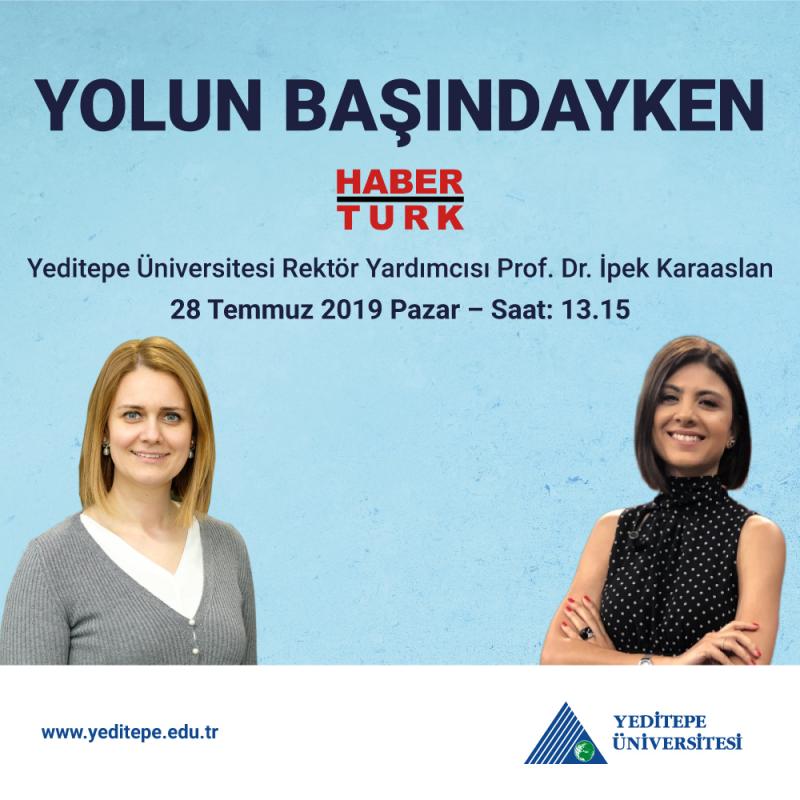 Yeditepe Üniversitesi Rektör Yardımcısı Prof. Dr. İpek Karaaslan 28 Temmuz 2019 Pazar günü 13.15’te Habertürk’te “Yolun Başındayken” programında Görkem İldaş’ın sorularını yanıtlayacak.