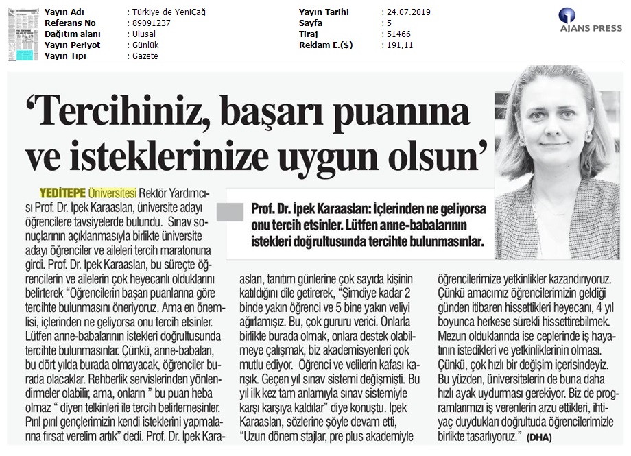Sınav sonuçlarının açıklanmasıyla birlikte üniversite adayı öğrenciler ve aileleri tercih maratonuna girdi. Prof. Dr. İpek Karaaslan bu süreçte öğrencilerin ve ailelerin çok heyecanlı olduklarını belirterek “Öğrencilerin başarı puanlarına göre tercih yapmasını öneriyoruz. Ama en önemlisi içlerinden ne geliyorsa onu tercih etsinler. Lütfen anne-babalarının istekleri doğrultusunda tercih yapmasınlar. Çünkü anne-babaları bu dört yılda burada olmayacak, öğrenciler burada olacaklar. Rehberlik servislerinden yönlendirmeleri olabilir ama onların “bu puan heba olmaz” diye yaptıkları telkinlerle tercih yapmasınlar. Pırıl pırıl gençlerimizin kendi isteklerini yapmalarına fırsat verelim artık” dedi.