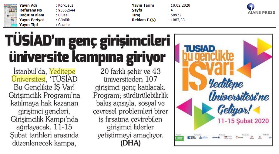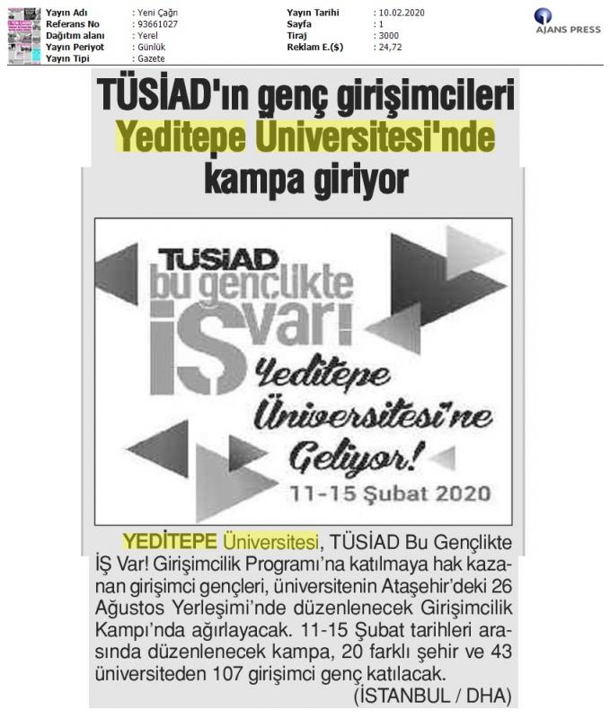 Yeditepe Üniversitesi, TÜSİAD Bu Gençlikte İŞ Var! Girişimcilik Programı’na katılmaya hak kazanan girişimci gençleri, üniversitenin Ataşehir’deki 26 Ağustos Yerleşimi’nde, 11 – 15 Şubat tarihleri arasında düzenlenecek Girişimcilik Kampı’nda ağırlayacak