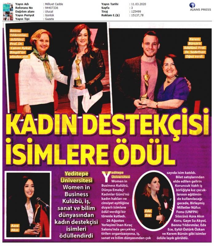 Türkiye’de kadınların iş ve sosyal hayattaki yerleri ve hakları konusunda farkındalık yaratmak ve henüz üniversite sıralarındayken çalışmalar yapmalarını sağlamak amacıyla kurulan Yeditepe Üniversitesi Women in Business Kulübü, “Dünya Emekçi Kadınlar Günü”nü kadın hakları ve cinsiyet eşitliğine duyarlı isimlere ödül verdiği bir törenle kutladı.