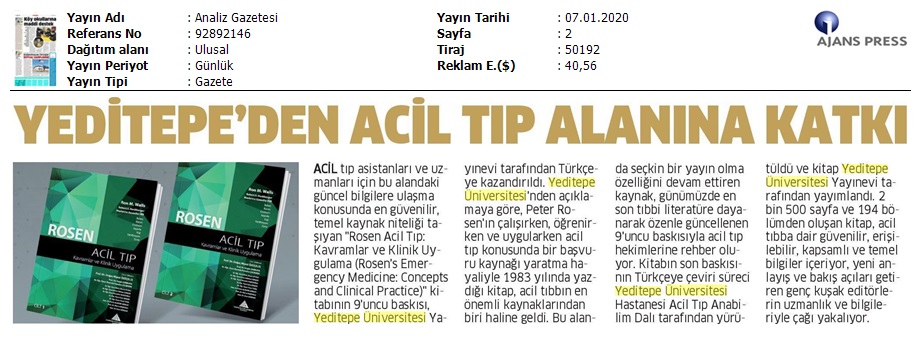 Kitabın son baskısının Türkçeye çeviri süreci Yeditepe Üniversitesi Hastanesi Acil Tıp Anabilim Dalı tarafından yürütüldü ve kitap Yeditepe Üniversitesi Yayınevi tarafından yayımlandı. 2.500 sayfa ve 194 bölümden oluşan kitap, acil tıbba dair güvenilir, erişilebilir, kapsamlı ve temel bilgiler içeriyor; yeni anlayış ve bakış açıları getiren genç kuşak editörlerin uzmanlık ve bilgileriyle çağı yakalıyor.