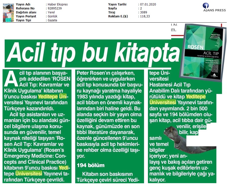 Acil tıp asistanları ve uzmanları için bu alandaki güncel bilgilere ulaşma konusunda en güvenilir, temel kaynak niteliği taşıyan “Rosen Acil Tıp: Kavramlar ve Klinik Uygulama” (Rosen’s Emergency Medicine: Concepts and Clinical Practice) kitabının 9’uncu baskısı Yeditepe Üniversitesi Yayınevi tarafından Türkçeye kazandırıldı.