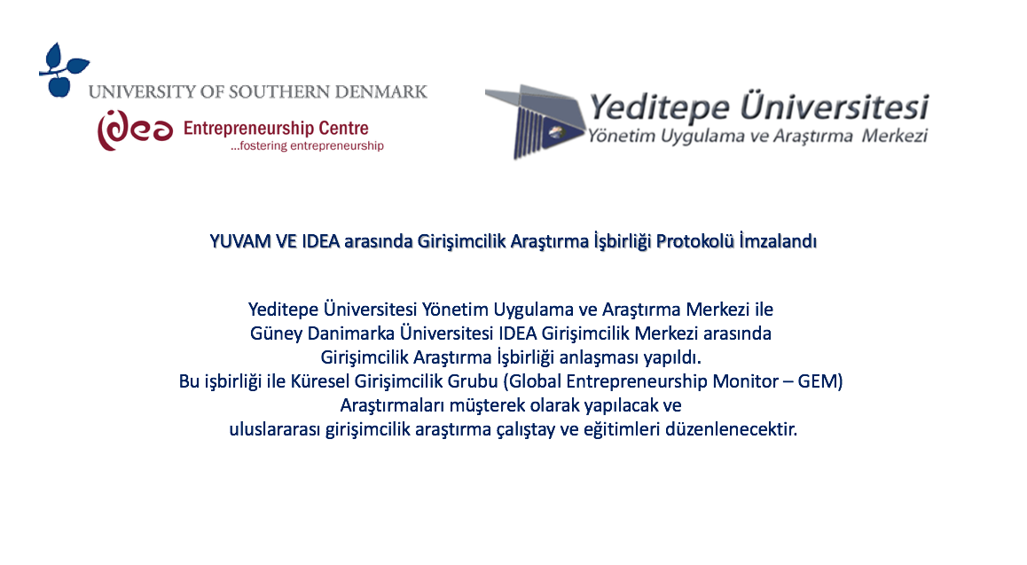 Yeditepe Üniversitesi Yönetim Uygulama ve Araştırma Merkezi ile Güney Danimarka Üniversitesi IDEA Girişimcilik Merkezi arasında Girişimcilik Araştırma İşbirliği anlaşması yapıldı